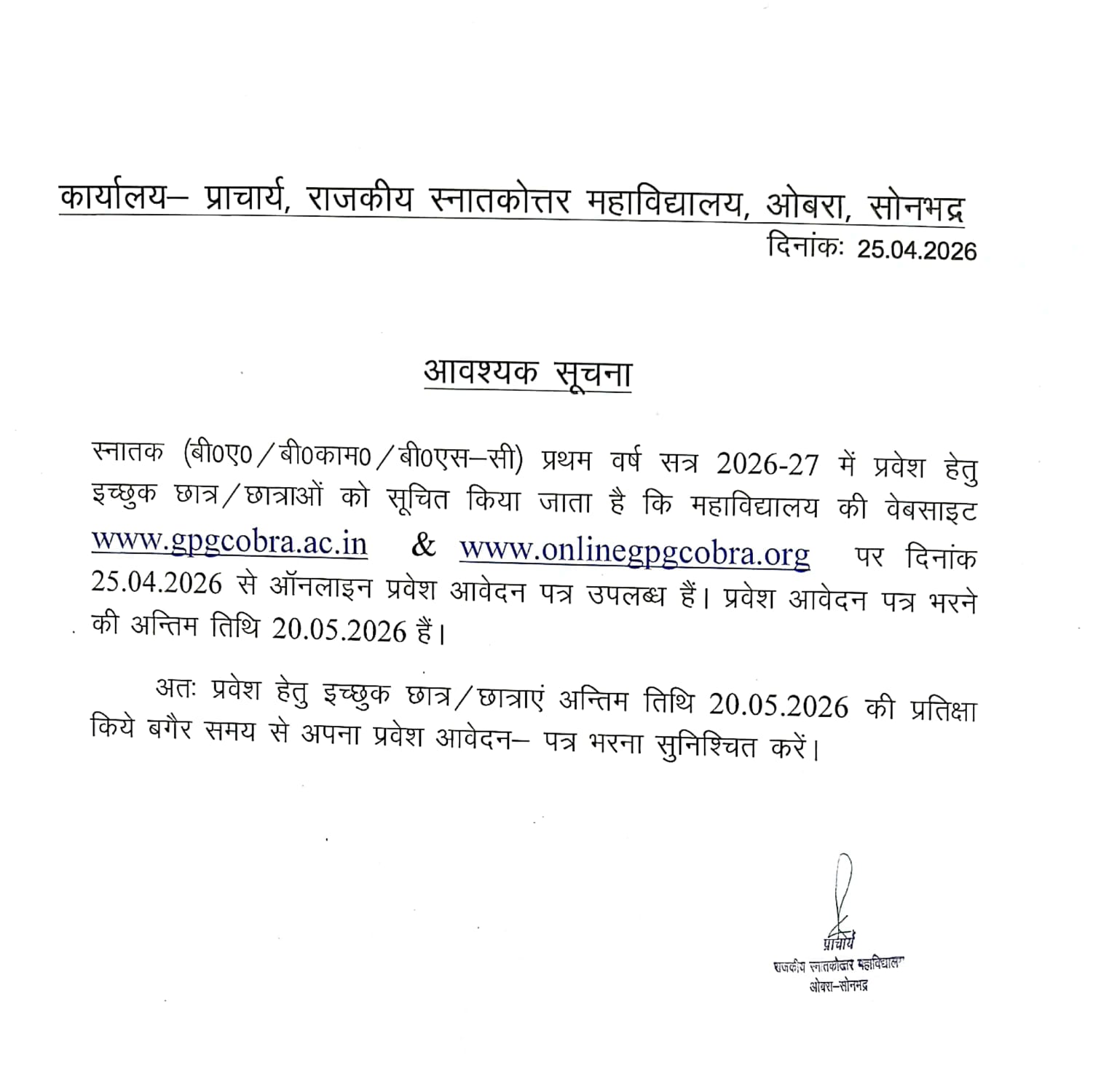 सत्र 2025-26 स्नात्तक प्रथम वर्ष प्रवेश सूचना